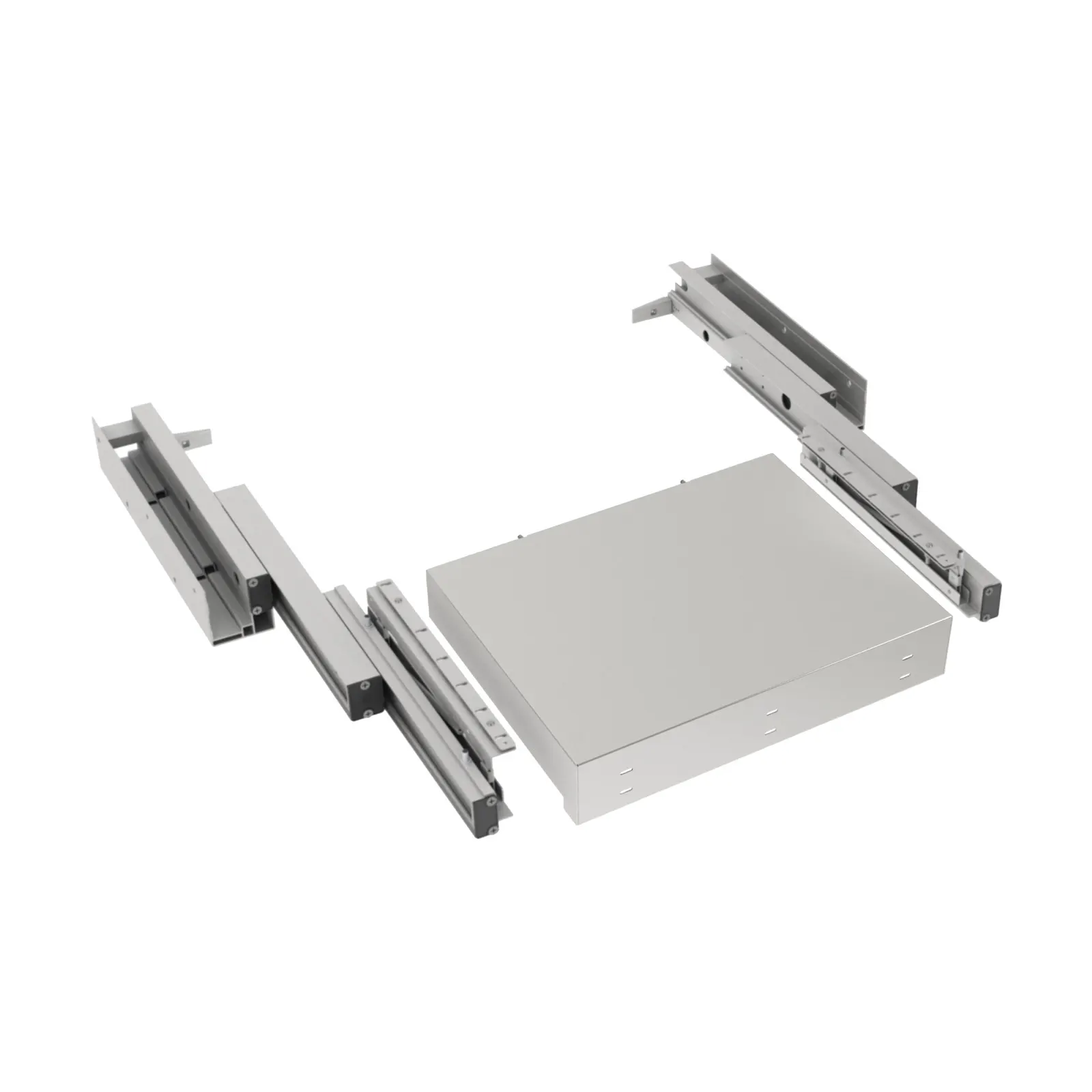 - Allโinterno dellโimballo, ESSETRE fornisce esclusivamente gli elementi strutturali del piano di lavoro (le guide e la piana) e la ferramenta necessaria per il corretto montaggio. ESSETRE NON FORNISCE I MATERIALI DI RIVESTIMENTO. La struttura va completata dal Cliente mediante lโapplicazione, tramite incollaggio, del materiale di rivestimento sul piano in alluminio.