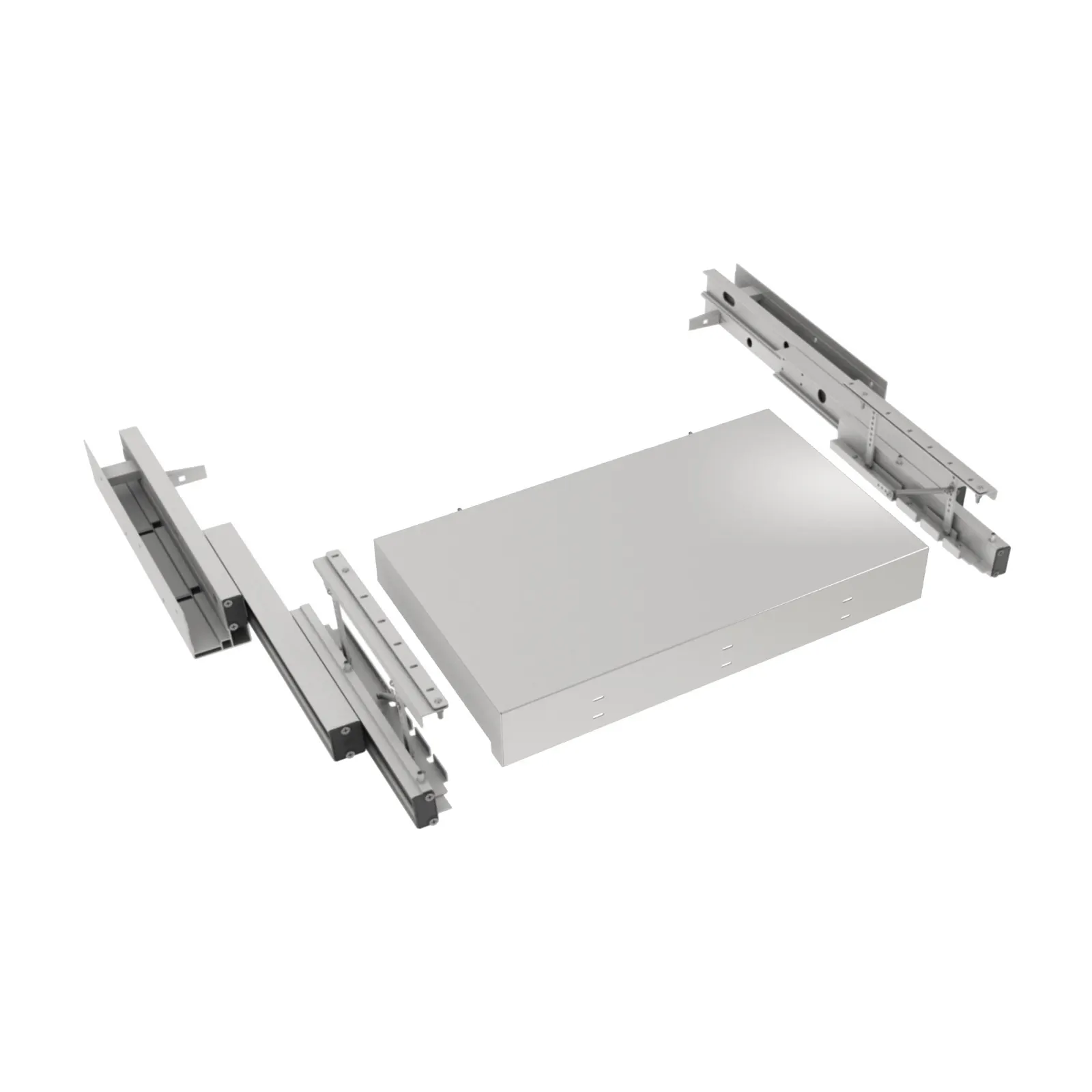 - Allโinterno dellโimballo, ESSETRE fornisce esclusivamente gli elementi strutturali del piano di lavoro (le guide e la piana) e la ferramenta necessaria per il corretto montaggio. ESSETRE NON FORNISCE I MATERIALI DI RIVESTIMENTO. La struttura va completata dal Cliente mediante lโapplicazione, tramite incollaggio, del materiale di rivestimento sul piano in alluminio.