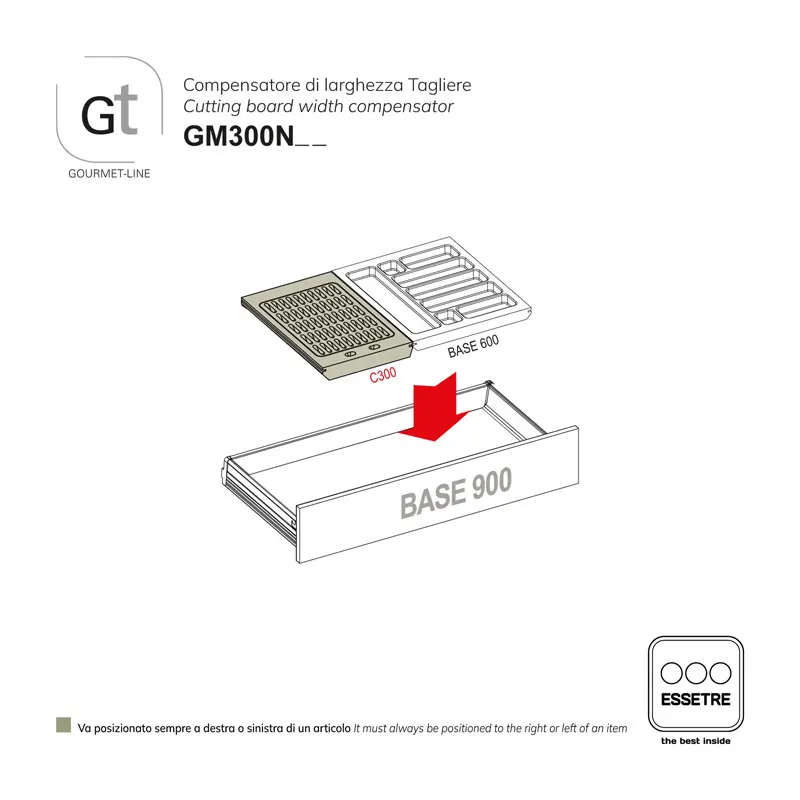 - Con lโimpiego di questo articolo รจ possibile abbinare due o piรน ACCESSORI GOURMET-LINE allโinterno dello stesso cassetto.ย Il compensatore va sempre posizionato a DESTRA o a SINISTRA di un accessorio.