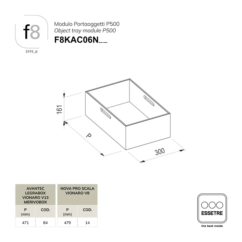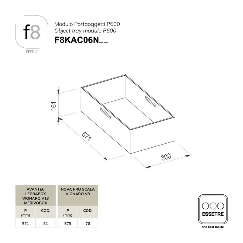 - I moduli EFFE_8 presentano DIMENSIONI differenti in funzione del cestone di destinazione. In fase dโordine, aggiungere al codice articolo la DESINENZA relativa alla profonditร nominale del cestone.