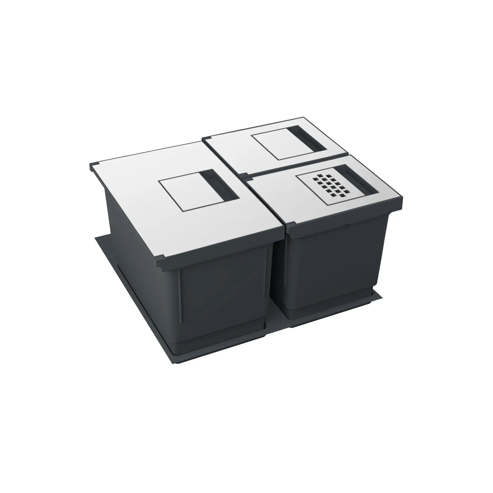 - L’articolo si compone di un SUPPORTO in PLASTICA con TASCHE SAGOMATE sulla forma dei contenitori. Le tasche sono disegnate per alloggiare perfettamente i contenitori sul supporto e per garantire la stabilitร durante le fasi di apertura e chiusura del cestone.