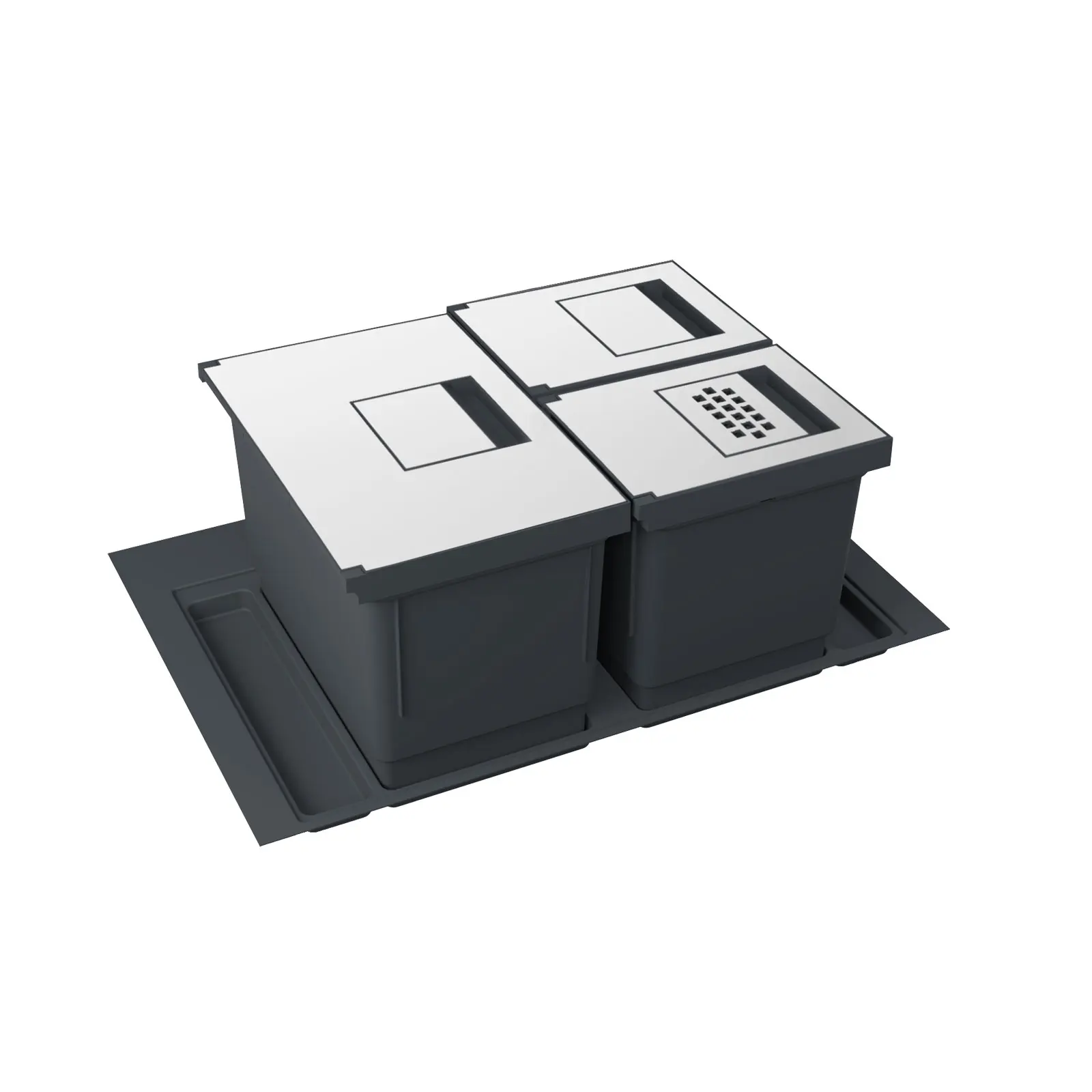 - L’articolo si compone di un SUPPORTO in PLASTICA con TASCHE SAGOMATE sulla forma dei contenitori. Le tasche sono disegnate per alloggiare perfettamente i contenitori sul supporto e per garantire la stabilitร durante le fasi di apertura e chiusura del cestone.