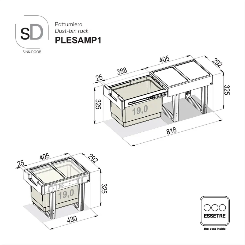 Pattumiera a LIBERA INSTALLAZIONE nelle basi lavello CON ANTA BATTENTE.